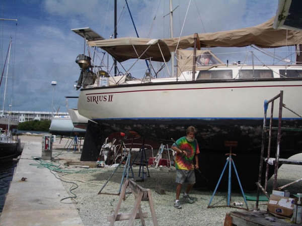 In accordance with recent EPA rulings, at least the local interpretation thereof, only certified personnel may do the sanding and application of antifouling paint. The yardman explained that the water from the initial wash down when the boat comes out of the water is now filtered before it flows back into the harbor. Yeah, right! The light sanding is done with a sander attached to a vacuum hose, and a thick, absorbent drop cloth covers the ground while applying the paint. This, of course, is an additional charge for me for which I had not budgeted.