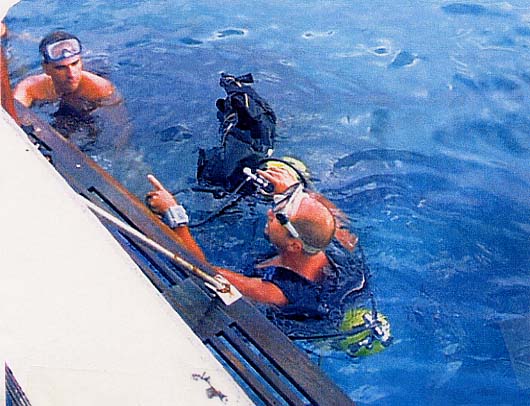 Diving instructor readying a German tourist for scuba diving.
