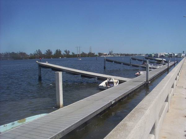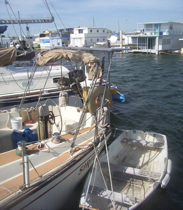 Photo One: Over the cockpit of the Sirius II toward the stern of the Rejoyce (white with round windows) before Wilma. The houseboat two slips to the right is already aground, from Hurricane Katrina.