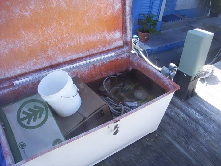 Photo Two: My dock box with bailing bucket, one day after the tidal surge.
